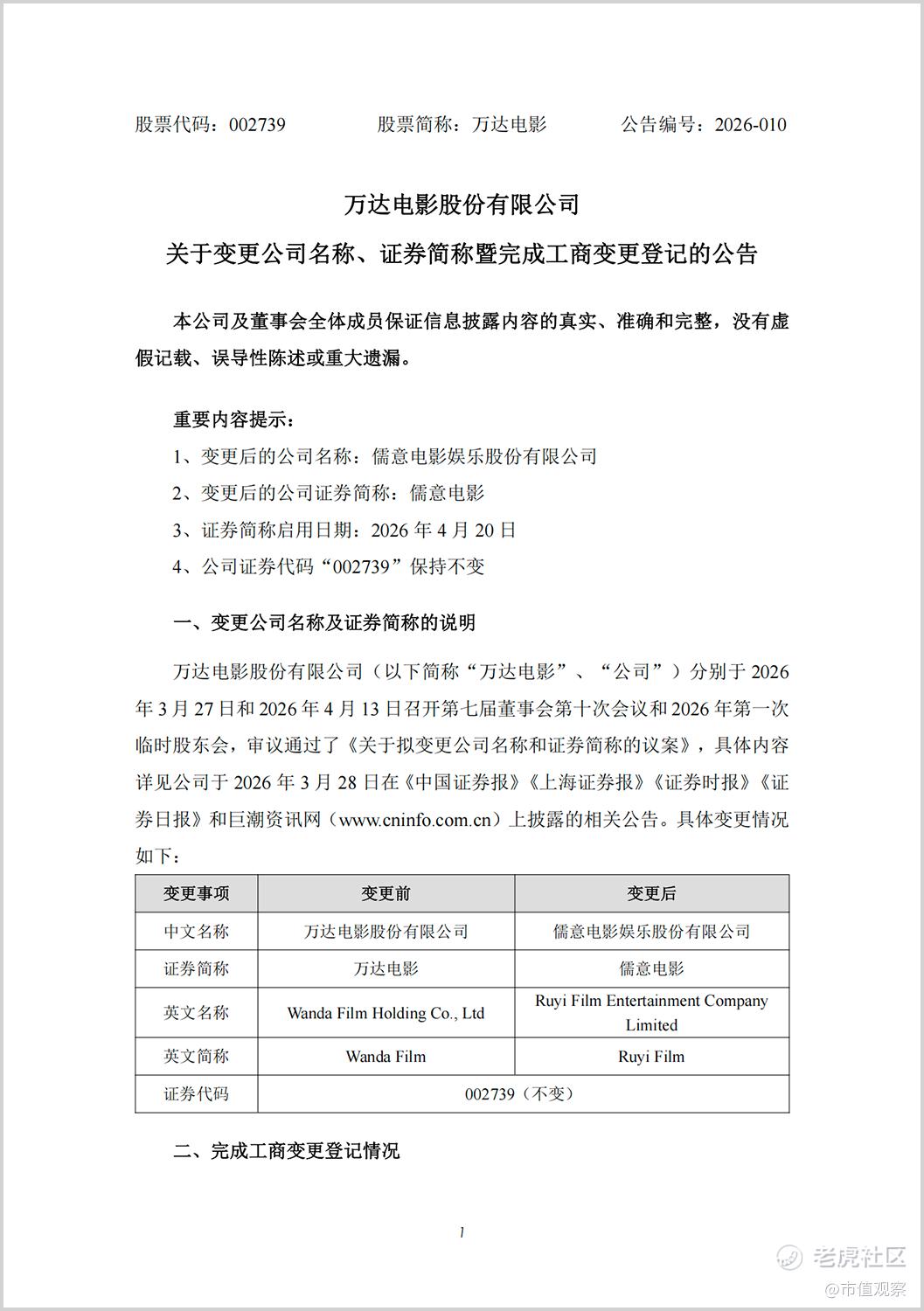 近日,万达电影发布公告称:公司已完成工商变更登记手续,名称变更为“儒意电影娱乐股份有限公司”,证券简称同步变更为“儒意电影”,新简称自4月20日起正式启用,证券代码保持不变。
