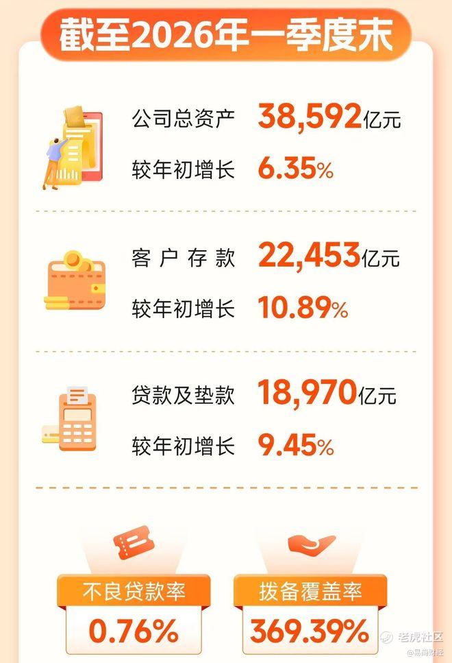 截至2026年3月末,宁波银行资产总额38,592.25亿元,较年初增长6.35%;贷款及垫款18,970.45亿元,较年初增长9.45%;客户存款22,453.06亿元,较年初增长10.89%。