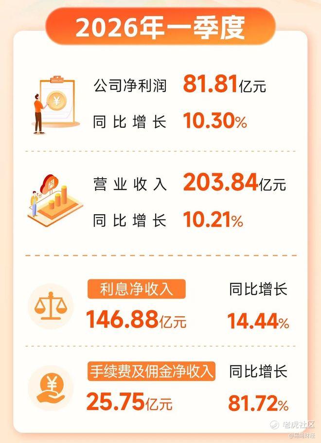 2026年一季度,宁波银行实现归属于母公司股东的净利润81.81亿元,同比增长10.30%;实现营业收入203.84亿元,同比增长10.21%,其中利息净收入146.88亿元,同比增长14.44%,手续费及佣金净收入25.75亿元,同比增长81.72%。在净利润和营业收入实现“双十”增长的同时,利息净收入、手续费及佣金净收入均表现亮眼,使得宁波银行经营发展根基持续夯实。