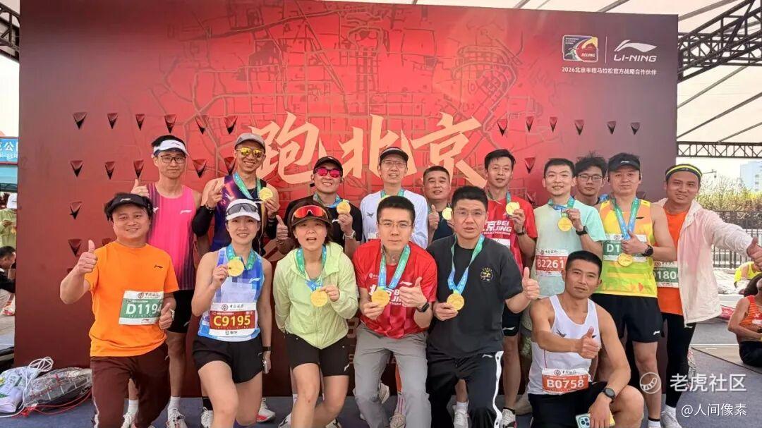 前不久的北京半马,李宁公司有一百多名员工站上了赛道,像是一场自发的社群“团建”。比赛前,大家在跑步群里互相鼓劲、喊话打气;赛道上,偶尔撞见同事,一个眼神就是加油;终点线旁,完赛者在终点的服务区相见,一起拉伸放松,举着奖牌拍照,三三两两地复盘配速——还有人“卷”起了 PB (Personal Best,个人最好成绩),当场约好下次再来。