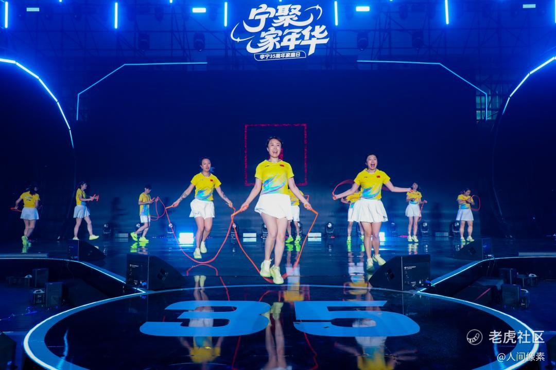 「王晓亮(中)和跳绳俱乐部在司庆舞台上表演花式跳绳」