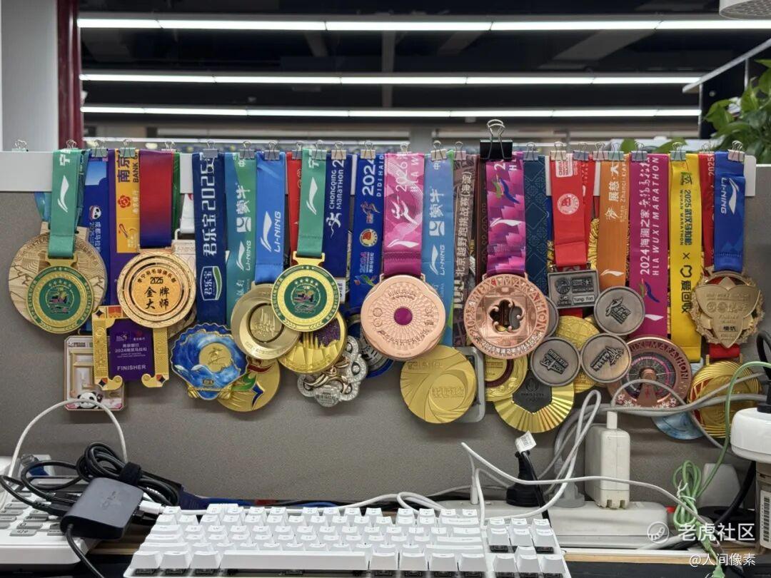 「杨帆的工位上,摆放着他的部分马拉松奖牌」