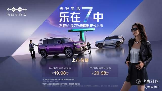 4月29日,方程豹钛7EV闪充版正式上市,推出675KM后驱闪充版、755KM后驱闪充版,售价分别为19.98万元、20.98万元。