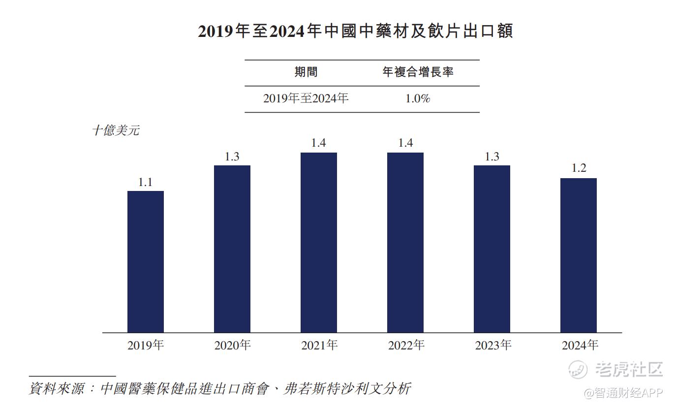 近年来,由于国际上对中医药治疗益处的认可日益提高及全球华人小区的影响力,中药饮片的海外市场经历显著增长。中国的中药材及饮片的出口额由2019年的11亿美元增至2024年的12亿美元,复合年增长率为1.0%。