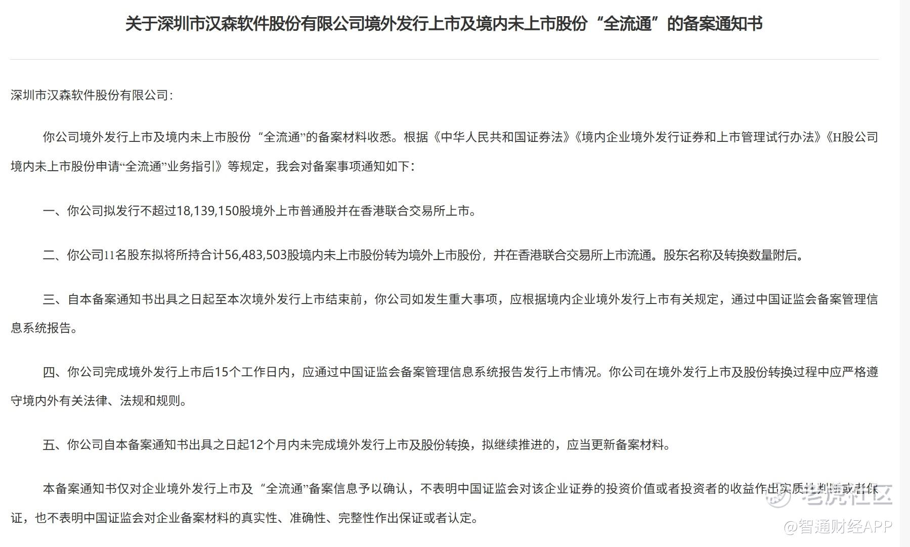 智通财经APP获悉,4月30日,中国证监会国际合作司发布《关于深圳市汉森软件股份有限公司境外发行上市及境内未上市股份“全流通”的备案通知书》。汉森软件拟发行不超过18,139,150股境外上市普通股并在香港联合交易所上市。公司11名股东拟将所持合计56,483,503股境内未上市股份转为境外上市股份,并在香港联合交易所上市流通。