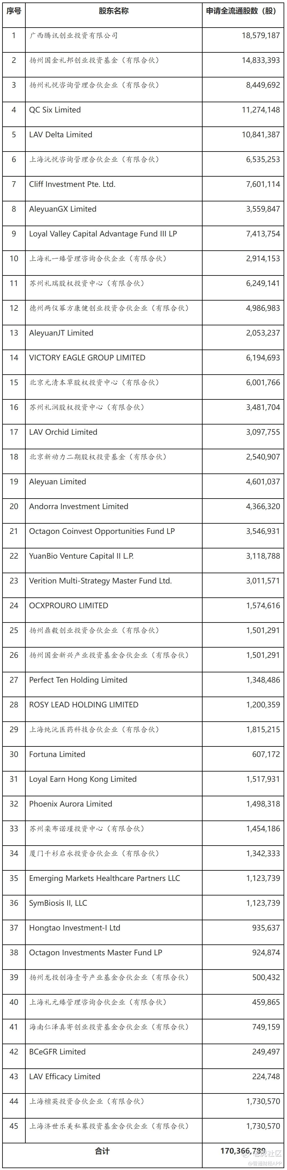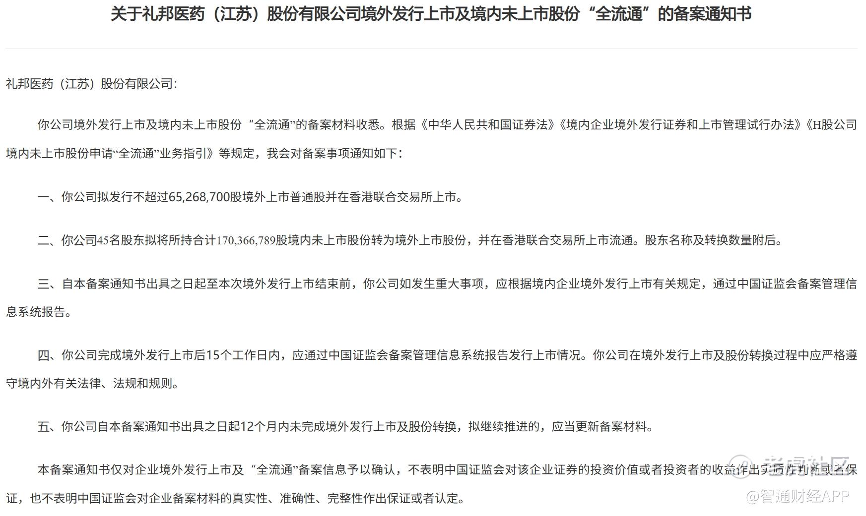 智通财经APP获悉,4月30日,中国证监会国际合作司发布《关于礼邦医药(江苏)股份有限公司境外发行上市及境内未上市股份“全流通”的备案通知书》。公司拟发行不超过65,268,700股境外上市普通股并在香港联合交易所上市。公司45名股东拟将所持合计170,366,789股境内未上市股份转为境外上市股份,并在香港联合交易所上市流通。