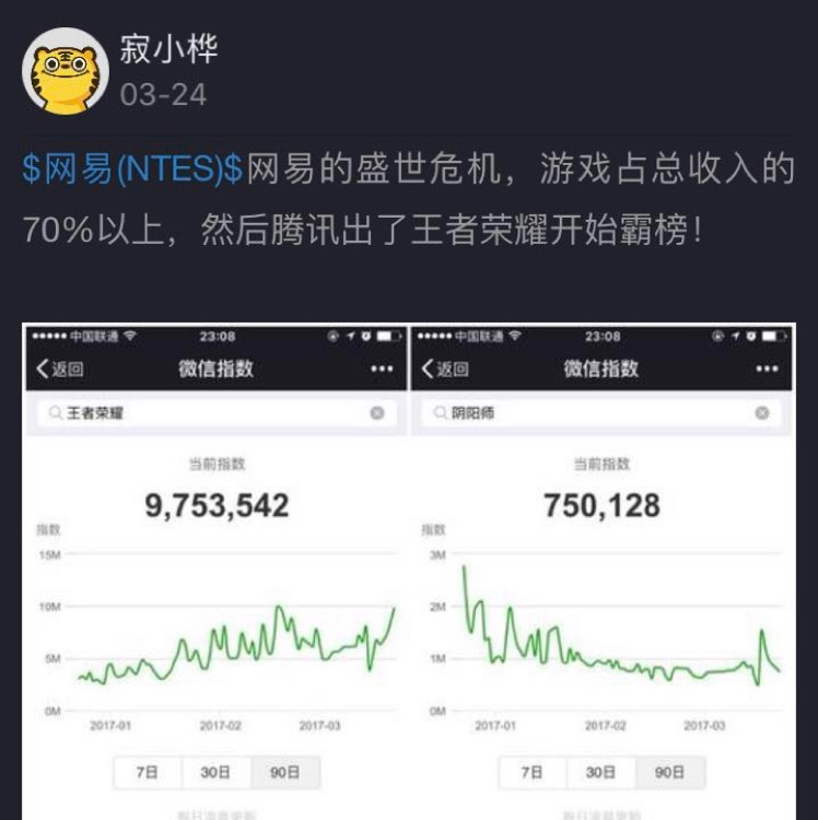 最近观察了下App Store 排行榜,网易游戏感觉有点下坡啊,尤其是腾讯王者荣耀这么强势情况下。看来需要认真看看网易去年的财报以及将要发的第一季度财报了。我觉得