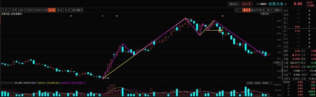 $奇景光电(HIMX)$前面做了一次空单,有虎友问做空的理由是什么,我不会做公司基本面分析,做下技术图形分析:日线高点9.68下面,4.88低点上来的上升趋势已经被破坏,反趋成立,看空,至于什么时候止跌,等待这笔向下趋势被破坏掉才能确定,拭目以待。