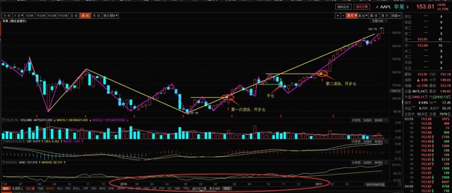 看下AAPL周线:之前并不知道老巴菲特在16年里建了那么多仓位,但K线上反映出了买点。中期低点(黄色)87.76上来,一个短期低点(紫色)被破坏,上涨趋势确立,100左右进场做多;接下来很不幸,110左右上涨趋势被破坏,按规则平仓出局。但随后的走势中,118.85左右第二次短期趋势突破,进场开多,这次进场价是比前面的平仓价高的,没办法,交易规则如此。目前策略是执股,等待上涨趋势被破坏平仓出局,至于到什价位,拭目以待。