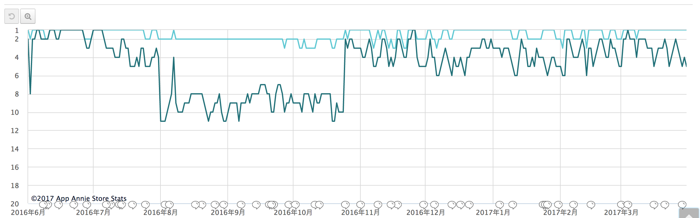同样简单粗暴看appAnnie的美国区下载排名统计的话,它并没有增长减缓的意思(浅色线是摄像类排名,深色是全类别排名)
