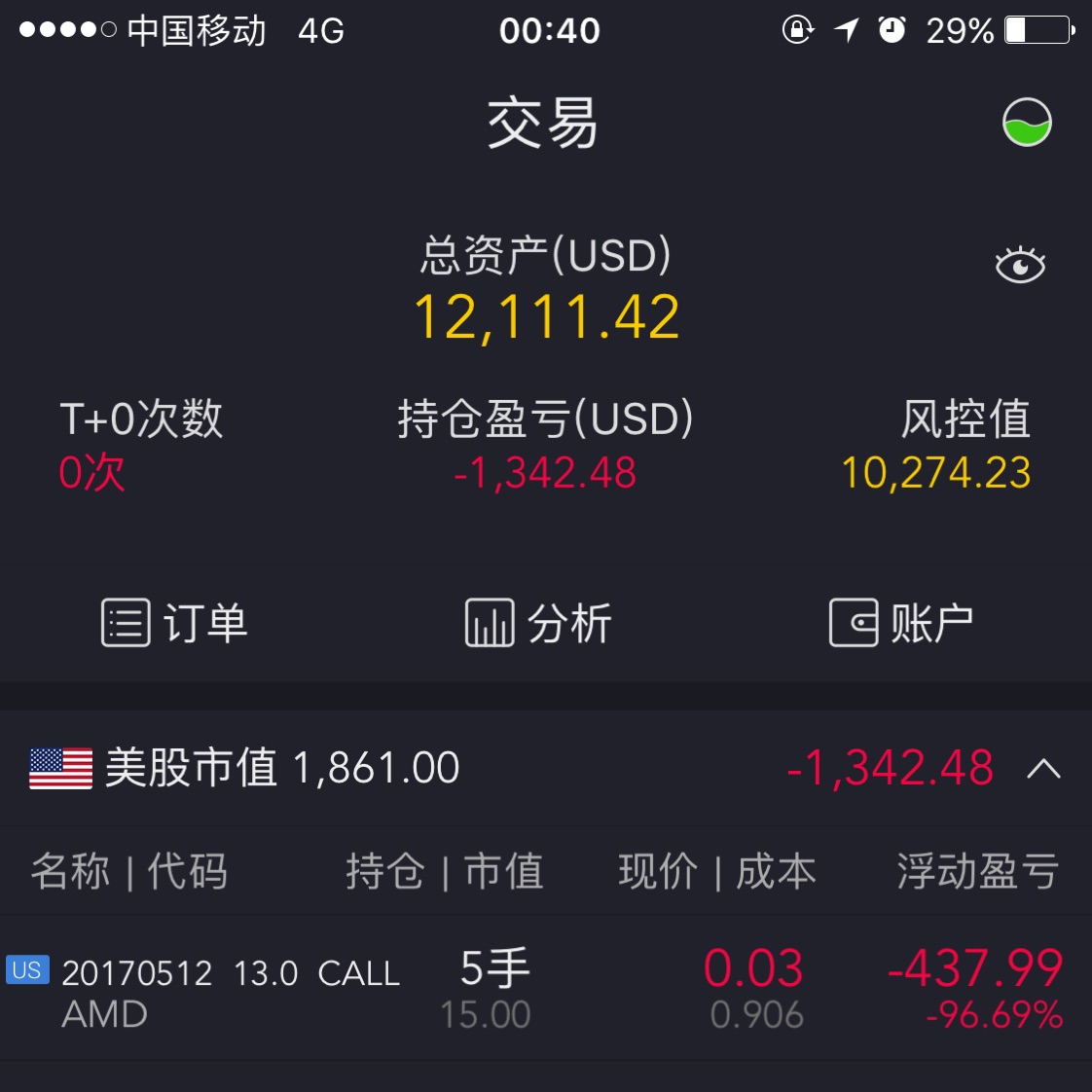 我今年1月份玩美股,进了8000美刀,4月前输的只有4000刀,4月开始玩期权,从4000刀到1万2,满足了,只是提醒下,注意风险,我玩A股2年,盈利50个点,这里面的钱全是A股转来的,我A股最多盈利150点,现在加美股的钱盈利50个点,大哥,赚到钱了进口袋买了房子车子进银行了,那才是你的钱,