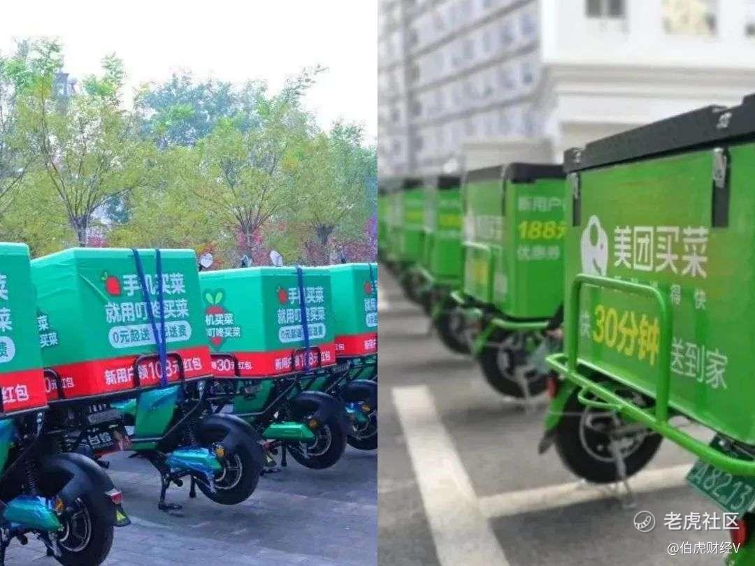 阿鱼住的地方附近,就有一个叮咚买菜的前置仓,上下班经常能看见叮咚买菜的骑手。有一天下班,她又在窄窄的巷子里遇见了骑手,仍是那套装备——绿色的配送服和配送箱。阿鱼下意识地以为这又是叮咚买菜的骑手,然而,待骑手经过,回头一看,配送箱上写着醒目的四个字:“美团买菜”。