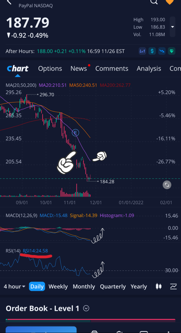 $PayPal(PYPL)$ holding puts right now is very risky. From 310 to 185.. that opportunity is already passed. If not, we don’t have much more to drop and an incentive to sell. Way more upside, for TA, a spring to 210 is imminent with an inevitable gap fill to 230 soon enough