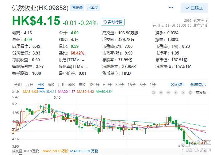 而从2021年12月10日优然的最新收盘价4.15港币来看,其对应总市值为157.51亿港币,按照最新的港币兑换人民币汇率0.8161计算,折合人民币128.54亿元。