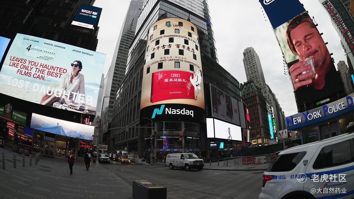 美国东部时间12月10日(北京时间12月10日晚间),纽约时代广场的Nasdaq大屏幕上,一幅巨型中药广告引起了人们的极大兴趣和广泛关注。大家发现,在这幅约7层楼高的橙黄色广告画面上,最醒目的是中国知名中药品牌“百年丹”固本延龄丸的产品形象和刚劲厚重的“千年古方,百年老店”八个汉字,还有“美国上市、中日合作”的醒目标识。据了解,该广告的发布者为今年3月23日才在美国纳斯达克上市的中国药企——大自然药业股份(Nasdaq股票简称UPC)。