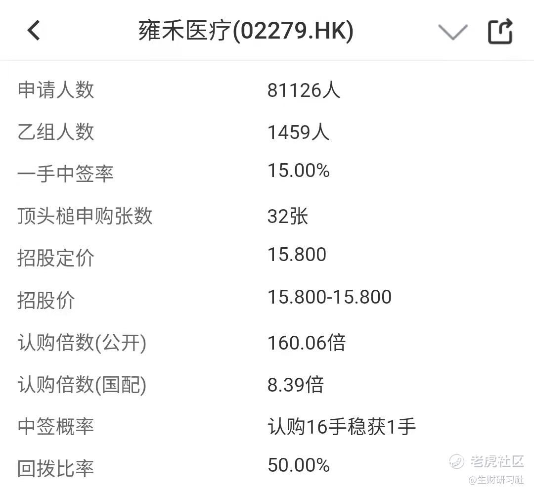 雍禾医疗,81126 人申购,其中乙组 1459 人申购,顶头槌 32 张,这感觉像是在参与港股打新,多少上一些人气了,很多人还是非常看好。