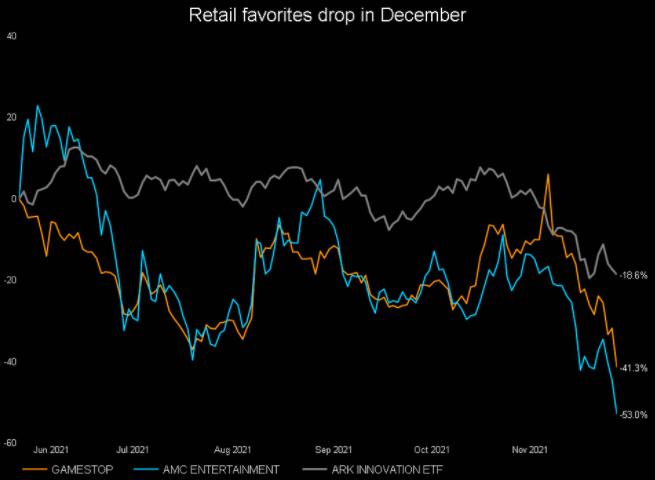 Those stocks have tumbled, with AMC down around 28% in the month-to-date and GameStop off nearly 25%.The estimated short interest at AMC increased to 19% of its free float from 16% at the end of November. GameStop short interest has shot up to 14% from 11% in the same period.