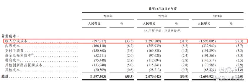 根据招股书,收入分成成本及内容成本是营业成本的最大组成部分。