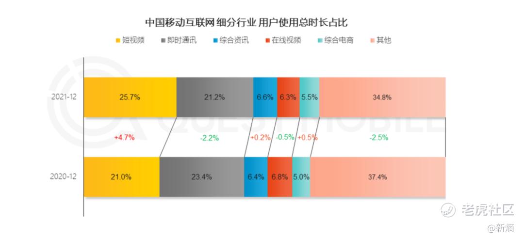 根据QuestMobile数据显示,2021年在移动互联网用户使用时长上,短视频超越社交软件成为用户花费时间最多的网络内容消费赛道。
