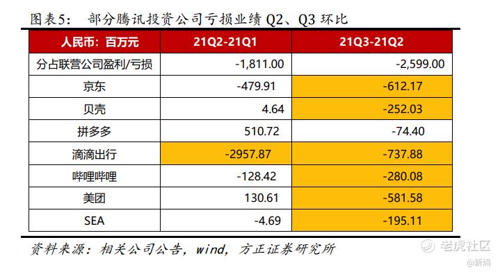 根据方正证券统计的部分腾讯持股上市公司的盈利情况可以发现,滴滴出行导致腾讯2021年Q3的亏损被放大;在2021年Q4,滴滴出行、京东、美团、贝壳、哔哩哔哩、SEA等亏损更是共同导致亏损放大至25.99亿。