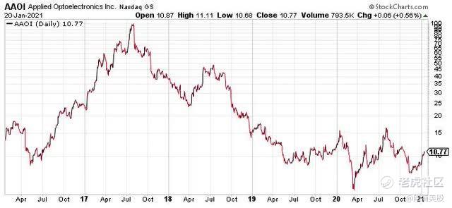投资者应该注意AAOI 在 2017 年年中见顶后尚未从随后的下跌中完全恢复。由于收入连续 2-3 年萎缩,该股下跌。但是AAOI表现出了一些活力。该股2021年初上涨了 26%,尽管仍远低于过去的水平。AAOI 一直依靠数据中心和 5G 为其提供动力,但这两个驱动程序暂时无法使用。只要人们对未来几年被认为表现良好的市场(如 5G 和数据中心)有很高的兴趣,相关参与者仍然可以从投机者押注要价中受益。光学播放器的需求明显,AAOI就是其中之一。