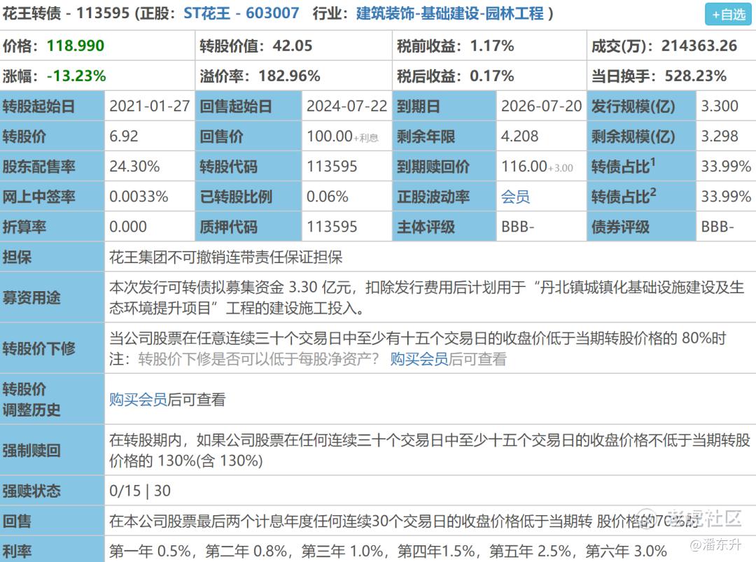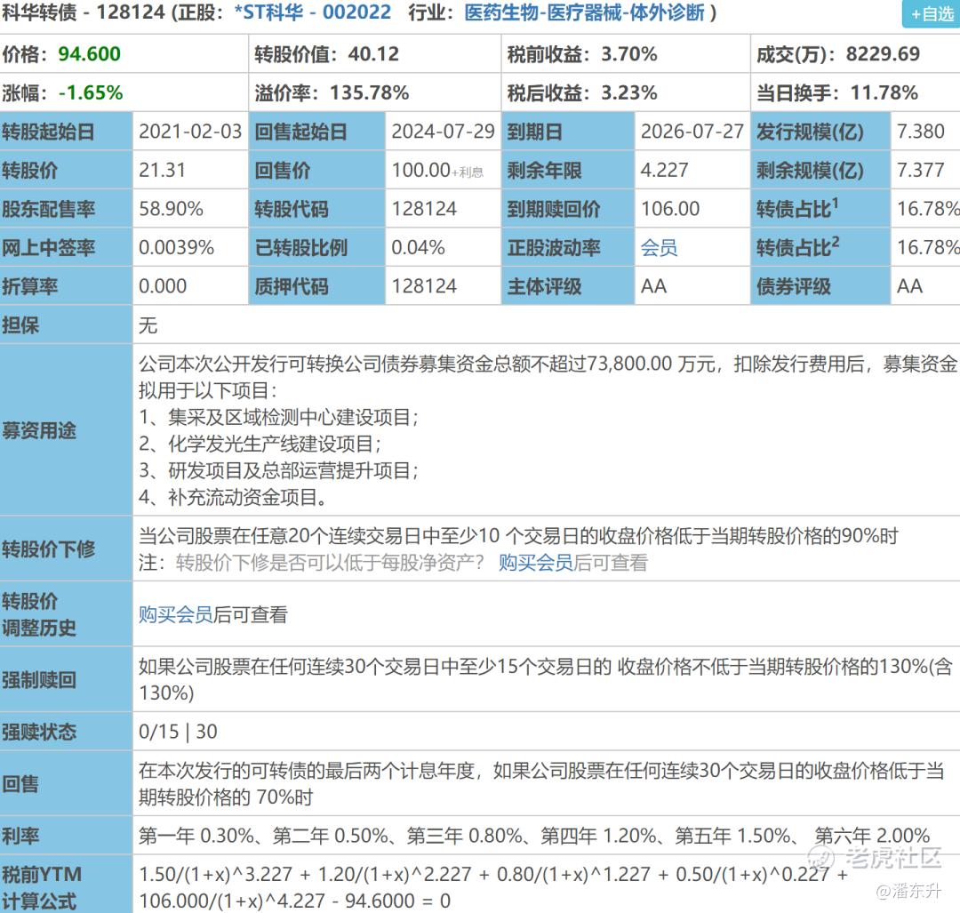 点评总结:科华生物控股股东属于格力底仓旗下子公司,即使公司退市,目前公司账面的资金也足够还债,不过仲裁结果大概率不会特别差。但是可转债的溢价率较高,短期也不会下修,只有仲裁结果向良性发展,股价才会反弹,那么可转债也就能解套了,目前看来整体风险可控。