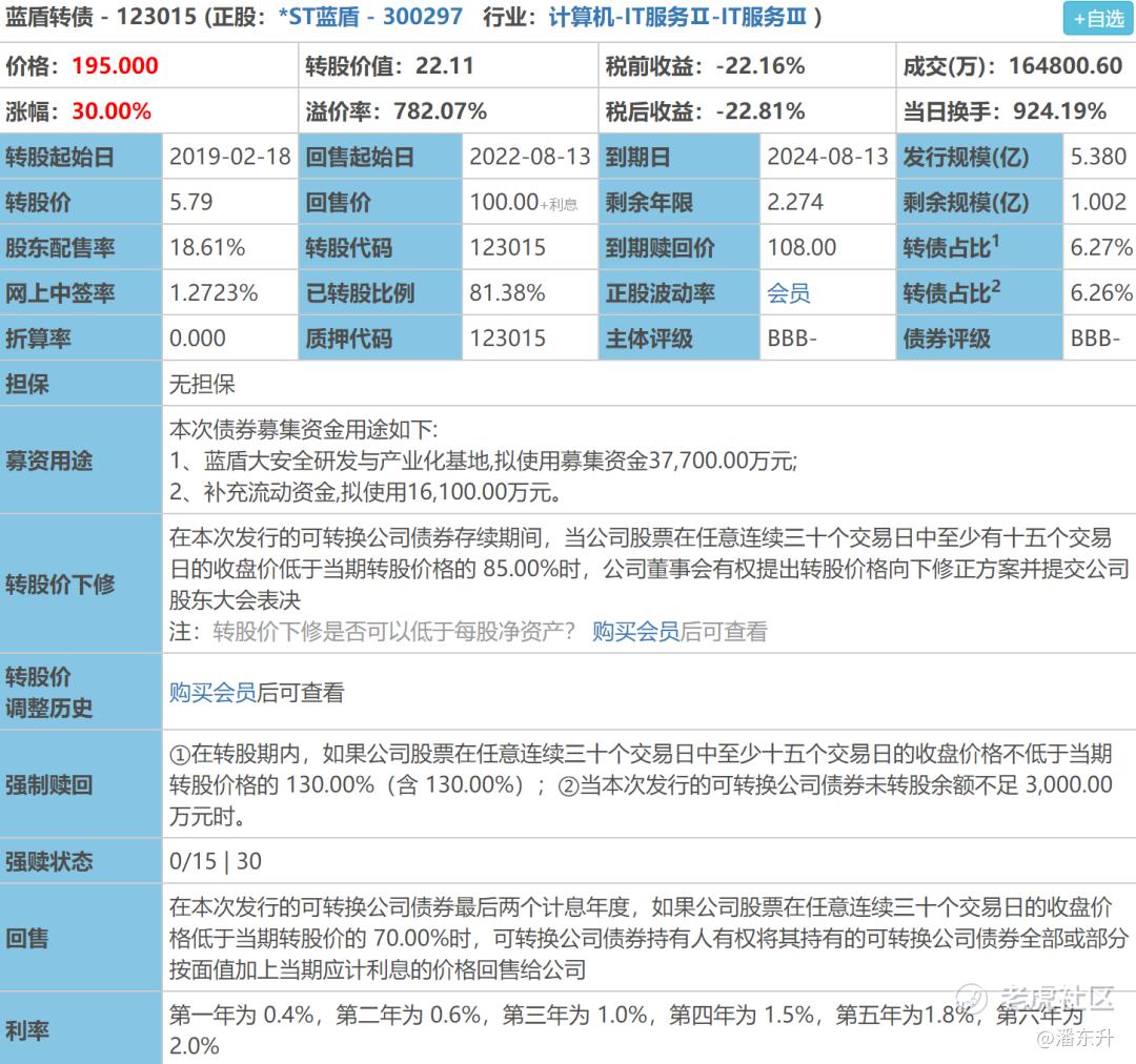 转债简介:转债信用级别BBB-级,评级极差;剩余规模1亿,规模迷你;到期赎回价108元,到期收益率-22%以上;转股价值22,溢价率高达782%;下修条款15/30,85%,比较严格。