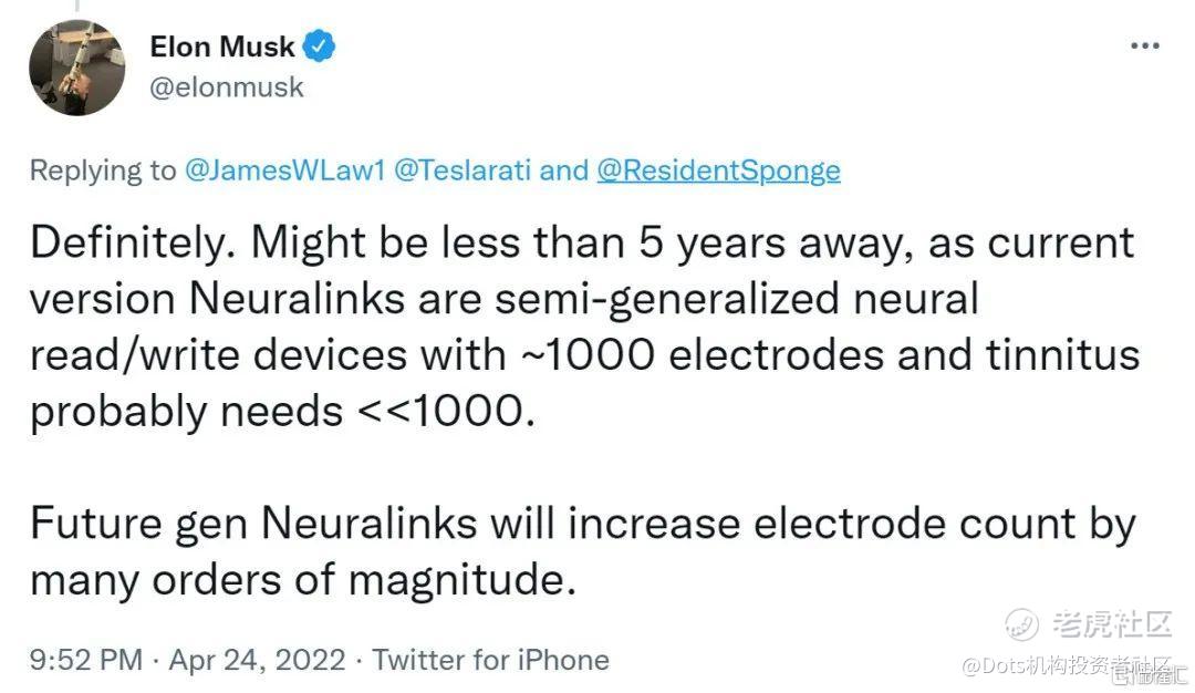 此时,一位网友评论道是否有希望解决耳鸣的问题,马斯克回复称,完全可以,而且会在5年内解决这一问题。目前的 Neuralink 有1000个电极,而要解决耳鸣问题则需要远大于1000个电极,下一代 Neuralink 的电极将会有数量级上的提升。