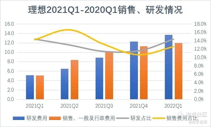 一季度理想研发费用13.7亿元,同比增长167%,占总营收的14.3%;销售、一般及行政费用12亿元,同比增长135.9%,占总营收的12.6%。
