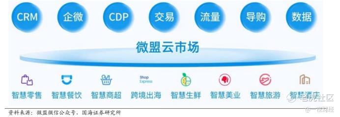 微盟的SaaS是基于微信平台,为商家搭建线上微商城和零售餐饮等O2O门店的产品,提供商品管理、用户管理、营销玩法、数据分析等等功能。其中,商业云重点布局电商、零售、餐饮、本地生活和酒旅等子类,推出了微商城、智慧零售、智慧餐厅、智慧酒店等一系列产品。