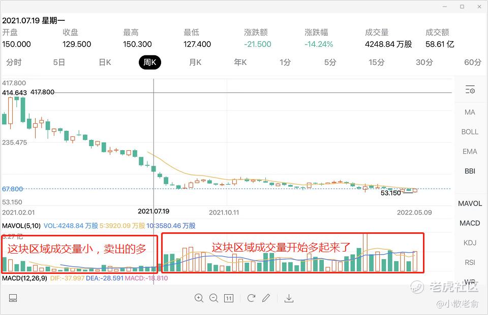 快手这只票从周K线来看更直观,我们可以看到成交量左边区域成交量小,卖出的多,而右边区域成交量开始多起来了,整体的一个走势就是前期左边区域跌幅巨大,而到了右边区域成交量开始慢慢上来后整个走势就从单边下跌变成了棋盘震荡的一个走势,至少从资金量上来讲也算是一个小拐点了。