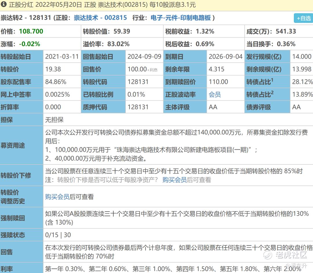 转债分析:转债信用级别AA级,评级一般;剩余规模14亿;到期赎回价110元,到期收益约1%;转股价值59.39,溢价率83%;下修条款15/30,85%,较为严格。