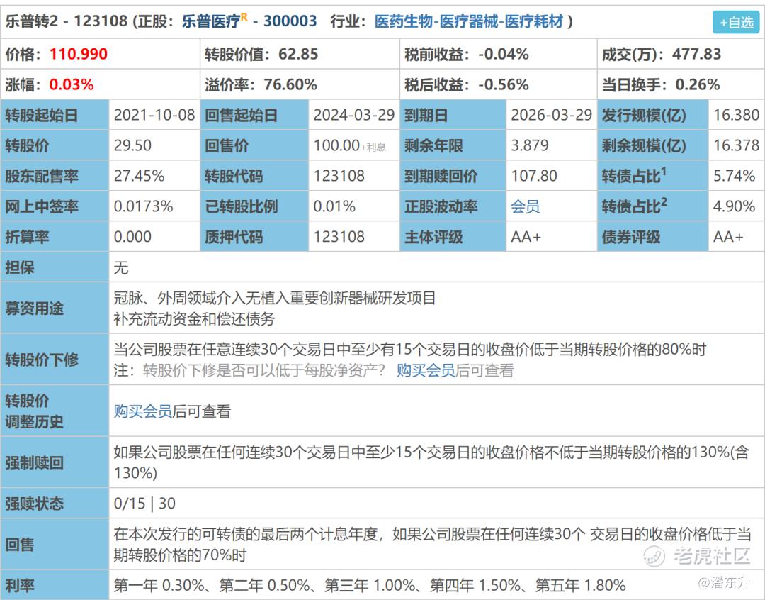 后市前景:乐普医疗作为我国心血管医疗器械研发的龙头企业,市场占有率高,且科研实力强。公司短期会受到集采等因素影响,长期发展趋势较好。且乐普转债上市仅用8个月即实现强赎,乐普资金实力雄厚,目前价格虽略超到期赎回价,整体下跌有限,上涨空间大。