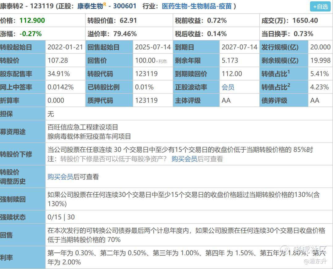 转债分析:转债信用级别AA+级,评级较高;剩余规模16.38亿;到期赎回价107.8元,到期收益为负;转股价值62.85,溢价率76.6%;下修条款15/30,80%,比较严格。