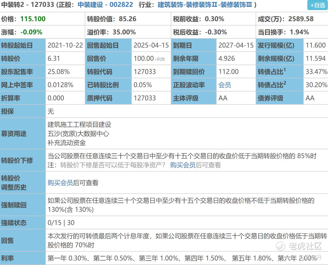 转债简介:转债信用级别AA级,评级一般;剩余规模11.6亿;到期赎回价112元,到期收益为负;转股价值85.26,转股溢价率35%;下修条款15/30,85%,较为严格。