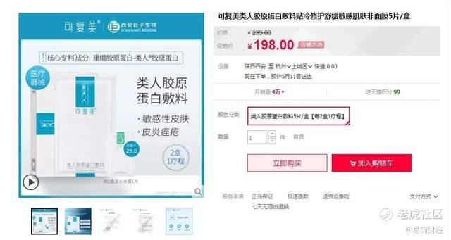 天猫旗舰店显示,可复美类人胶原蛋白面膜每盒售价198元,平均每片39.6元。这意味着,这一盒面膜的成本或仅20余元。