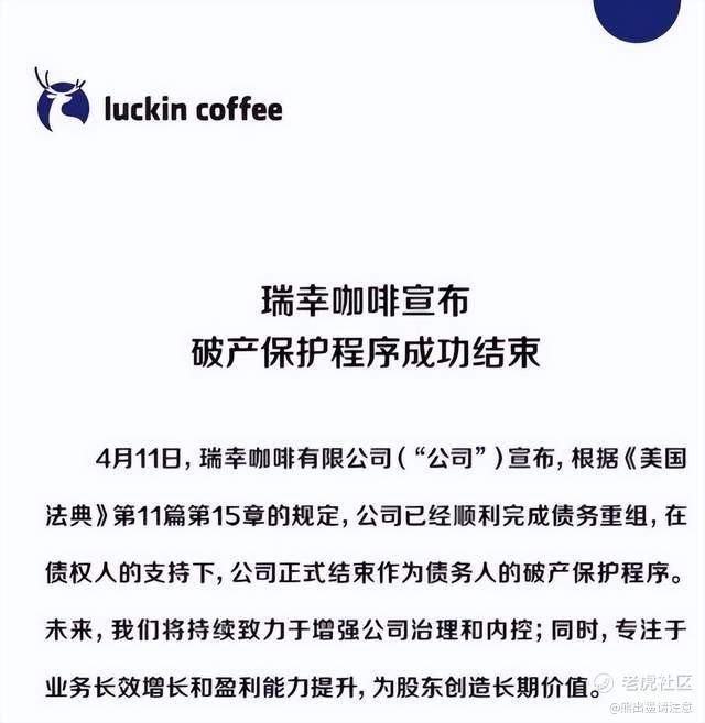 就在同一天,还有另外一条动态值得关注:瑞幸咖啡宣布,根据《美国法典》第11篇第15章的规定,公司已经顺利完成债务重组,在债权人的支持下,公司正式结束作为债务人的破产保护程序。