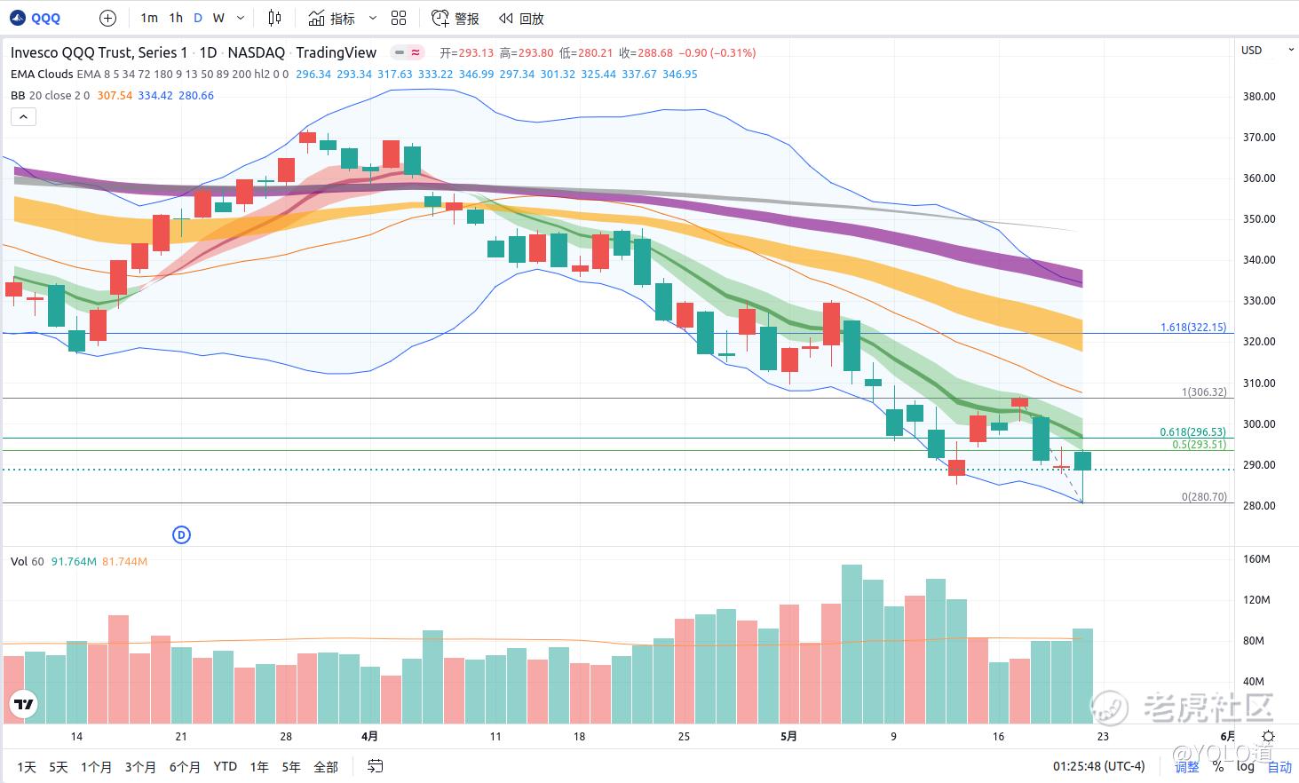 上周五三大指数高开低走,一幅大跌的景象。不过午盘后,开始拉盘,SPY收复全部跌幅,DIA和QQQ也只差一点。小时图上看,股价成功突破13日均线,多头似乎开始掌握主动。但是日线图上看,下跌趋势依然未能逆转,但风起于青萍之末,小时级别的逆转,可能是一个前兆,意味着上周五是个底部。今天大概率将上涨,目标是0.5延展位,在293附近。