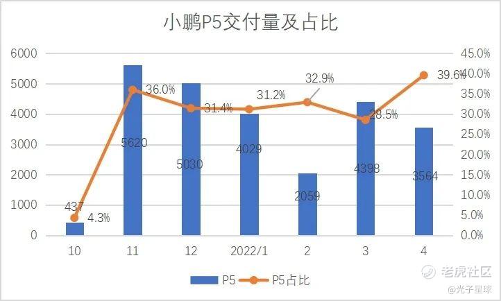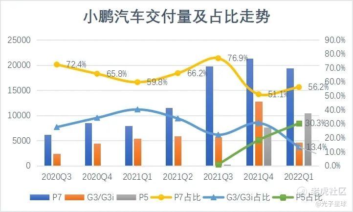 除了P7以外,小鹏P5也贡献了不少的销量,自去年三季度交付开始以来P5对小鹏的销量贡献迅速上升,在今年一季度已经超过G3i占到了小鹏该季度交付量的30%。