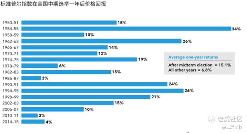 在经历了这些动荡之后,等到中期选举大局已定,市场往往会开始几个月的强劲反弹。历史表明,这通常并不是短期的利好,而是全年的。自1950年以来,中期选举后的1年里,平均收益率高达15.1%,是其他年份的两倍多(6.8%)。