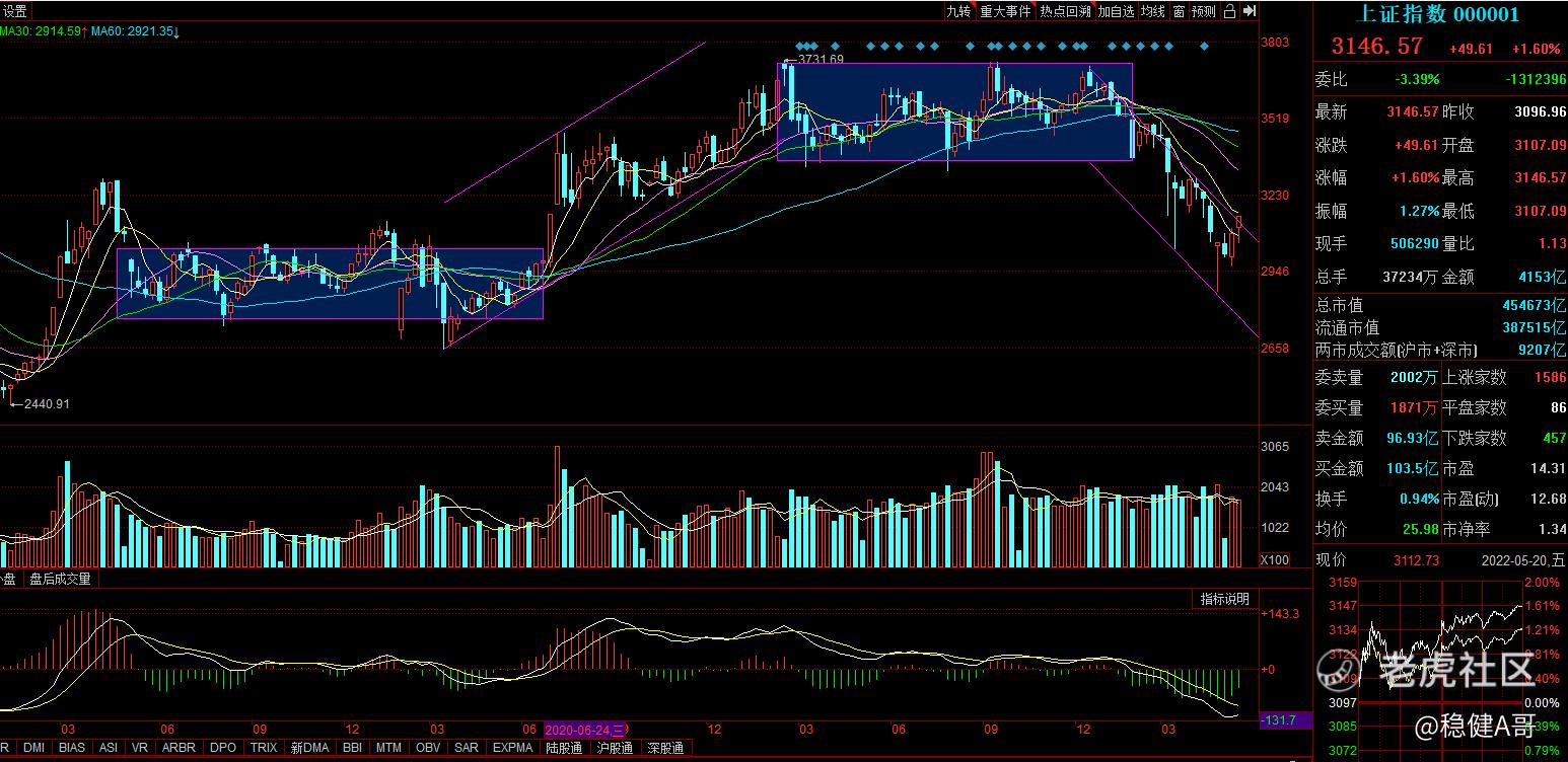 四月底开始反弹,五月第一周整理修复,第二周到现在的第三周开始强势反弹,阳盖阴强势突破3100点,下周就是3200点,其实进入五月份以来大家能看得到,就算有时候大盘指数不行,比较弱势,但是个股方面表现还是非常不错的。在外围市场的影响下,指数走出独立行情,,个股板块百花齐放,随着国内疫情的控制,复工复产,经济逐步转好,市场热度逐渐起来,还有政策方面的利好,所以不用担心后市,控制仓位这波行情要抓住了.