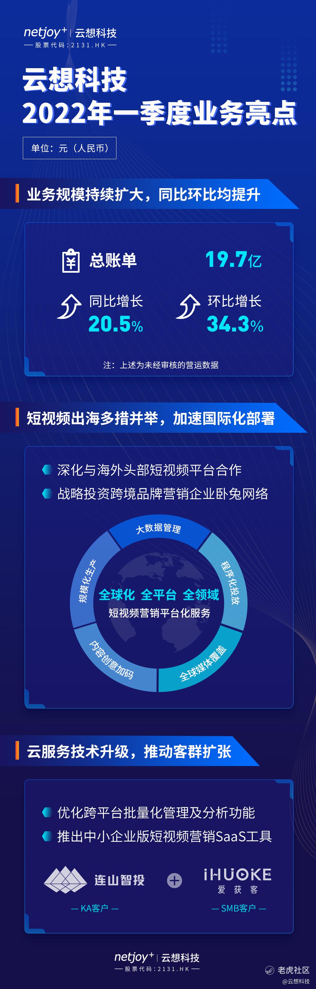 2022年5月17日,$云想科技(02131)$ 控股有限公司(「云想科技」,股份代号:2131)欣然公布,集团截至2022年3月31日止第一季度,总账单金额录得约人民币19.7亿元,较去年同期同比增长约20.5%,较上一季度环比增长约34.3%,占去年全年总账单近三成,业务规模保持稳步增长。
