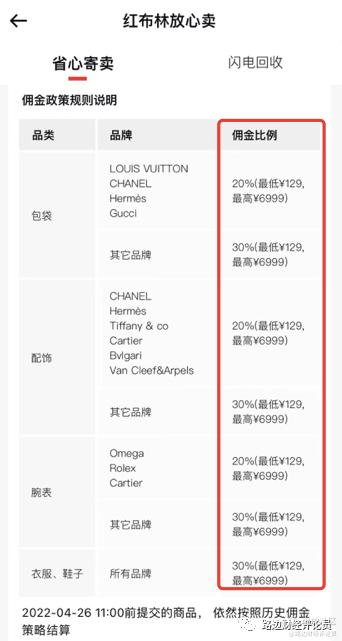 根据网友晒出的红布林寄卖政策调整公告显示,从4月26日11点开始,平台将对部分寄卖政策进行调整,除了LV、CHANEL、Hermes、Gucci等部分知名品牌的佣金还是20%外,其它品类的其他品牌,以及衣服鞋子的所有品牌,佣金比例都统一提高到30%。而且红布林还把最低佣金和最高佣金都同步进行了上调,分别从之前的69元、4999元,提高到129元、6999元。