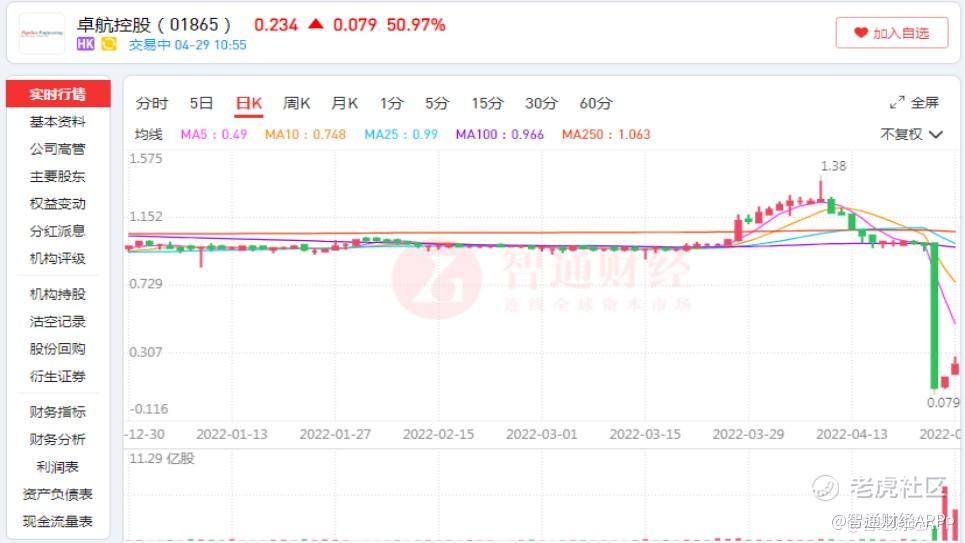 智通财经APP注意到,4月27日卓航控股股价发生剧震,当日从0.99港元的开盘价,最低下探至0.079港元,全天跌幅高达90.82%,俨然一副“财富收割机”的模样。4月28日,“剧本”开始改写,卓航控股股价大幅反弹72.22%,收于0.155港元,到了4月29日,股价盘中一度反弹超过80%,又化身为“财富代码”。