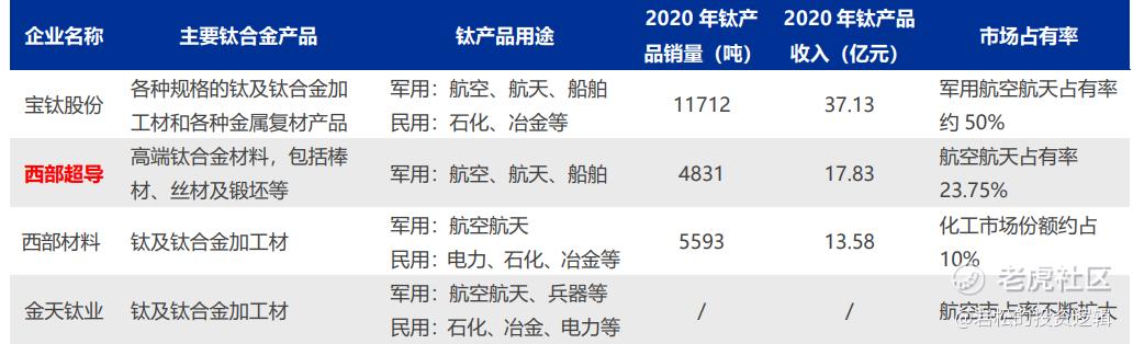 其中,宝钛股份涵盖钛产品全产业链,种类齐全,军民用领域均有涉及,在老机型、发动机领域占有较大份额;