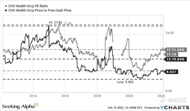 自2019年低点以来,CVS股价上涨了113%,在过去12个月中,该股的表现明显优于标准普尔500指数。但以过去三年为例,CVS的表现低于标准普尔500指数(价值增长了56%,而CVS仅增长了46%)。CVS的交易市盈率为17.14,这似乎既不是非常便宜,也不是非常昂贵。它仍然低于28的峰值市盈率(过去10年的最高数字),但接近过去十年的平均市盈率17.71。