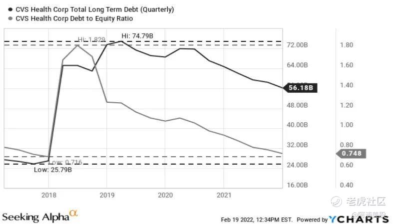 将2021年12月底的资产负债表与一年前(2020年12月底)的资产负债表进行比较时,几乎所有重要方面都在改善。一方面,债务水平(短期和长期)下降;另一方面,现金、现金等价物、投资或总权益增加。CVS的资产负债表进一步改善,尽管520亿美元的长期债务水平无疑是一笔巨款,但并不能担心CVS的偿付能力。考虑到CVS一年内可以产生150亿美元的营业收入,偿还未偿债务需要大约3.5倍的营业收入,这似乎是可以接受的。剩下的一个巨大问题是CVS资产负债表上的商誉。790亿美元的商誉是一个令人难以置信的高额金额。