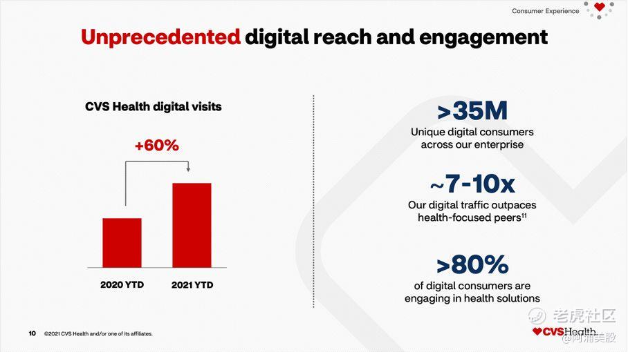 http://cvs.com是顶级健康网站之一,2021年的访问量超过20亿次,比上一年增长了近55%。公司在健康互动方面的数字化能力,如COVID检测和疫苗,处方服务以及健康和保健产品的销售,大大提高了所有CVS Health业务的消费者参与度。西维斯健康公司现在以数字方式为4000万客户提供服务,仅在过去六个月就增长了约10%。2021年,西维斯推出了几项由高级分析提供支持的全新数字健康服务,以个性化体验。公司使加入CarePass计划变得更加容易,本季度达到560万订户,同比增长超过40%。