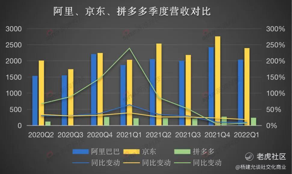 2022年第一季度,与去年同期相比阿里营收增长9%,京东营收增长18%,拼多多营收增长7%。整体来看,三家电商平台虽然都保持了营收增长,但增速均明显下降。其中,京东主要凭借自营品牌优势,仍保持了两位数的增长,不过增速已下滑至20%以下;而阿里和拼多多的增速已经下降到不足两位数。