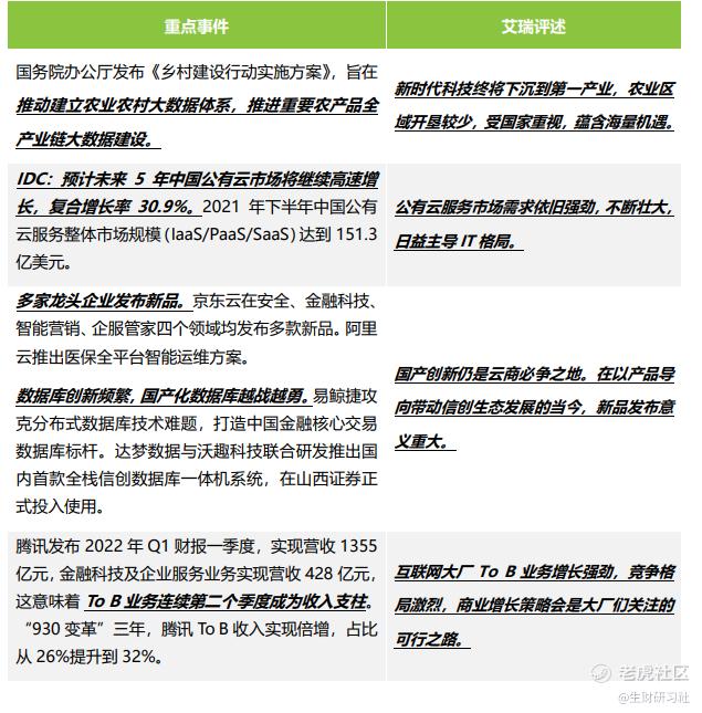 在重点新闻扫描上,5G 数据中心的建立仍是热点,IDC 发布的一系列市场规模报告均呈上升趋势。此外,各龙头厂商纷纷发布新品,为云市场注入多股创新活力,呈现产品创新渗透至生态创新的格局。在投融资事件梳理中,对于 5 月新增的投融资事件,SaaS 仍然是备受青睐的投资焦点,在投融资笔数、金额上仍领先。此外,5 月新增投资事件赛道还有云安全、数据库、数据中台,均在 1-2 件之间。